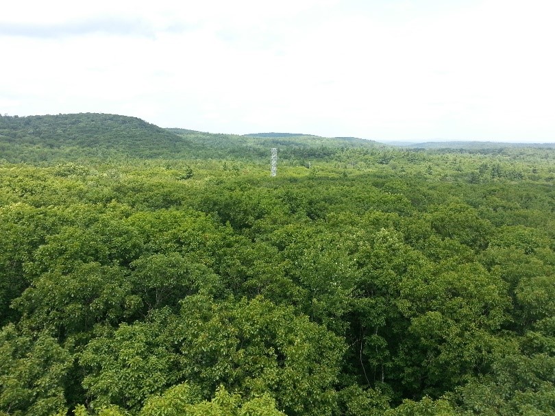 在哈佛大学森林生态研究站生态研究塔顶眺望整个哈佛森林。