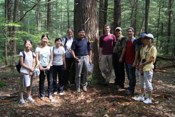 图为傅承新教授、于明坚副教授、赵云鹏副教授带领学生在哈佛大学哈佛森林生态研究站学习森林生态学知识。