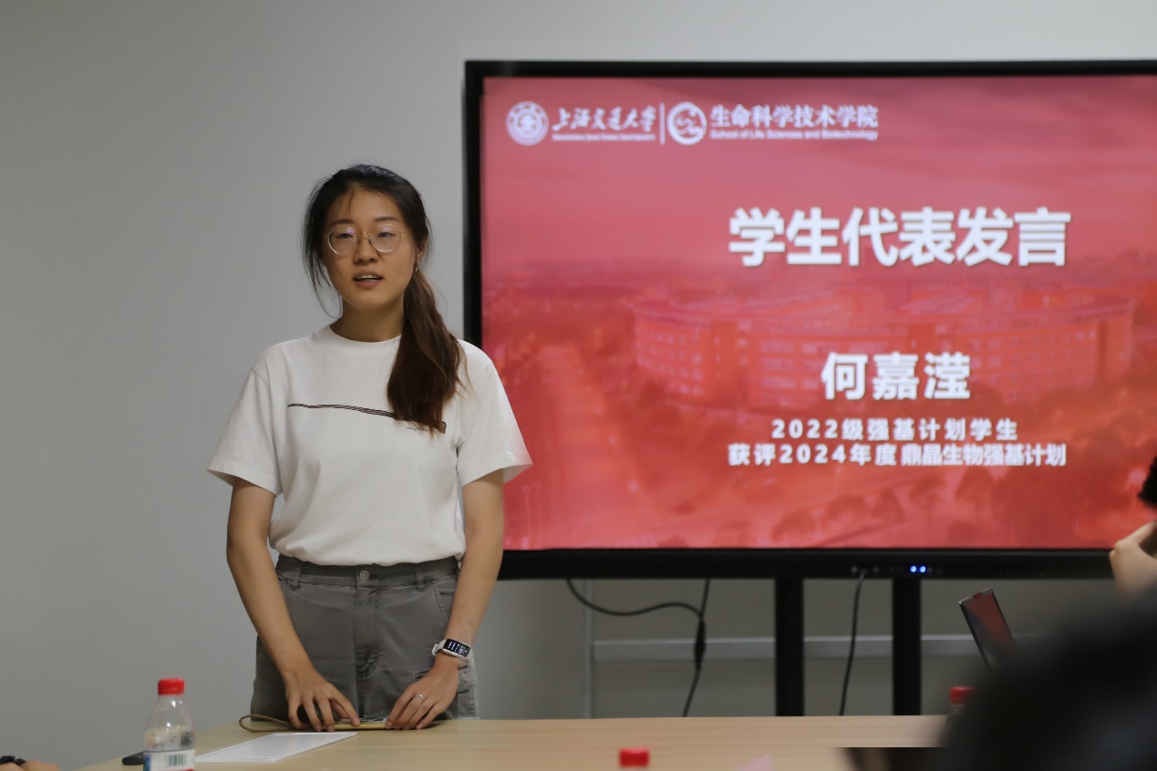 2024 年度获奖学生代表、2022 届强基计划的何嘉滢作为获奖学生代表发言。何嘉滢对罗鹏学长和鼎晶生物的支持与关怀表达了诚挚的感谢,并结合自己大学三年的学习和科研经历,分享了自己是如何找到“生长点”,在热爱的领域不断进行。
