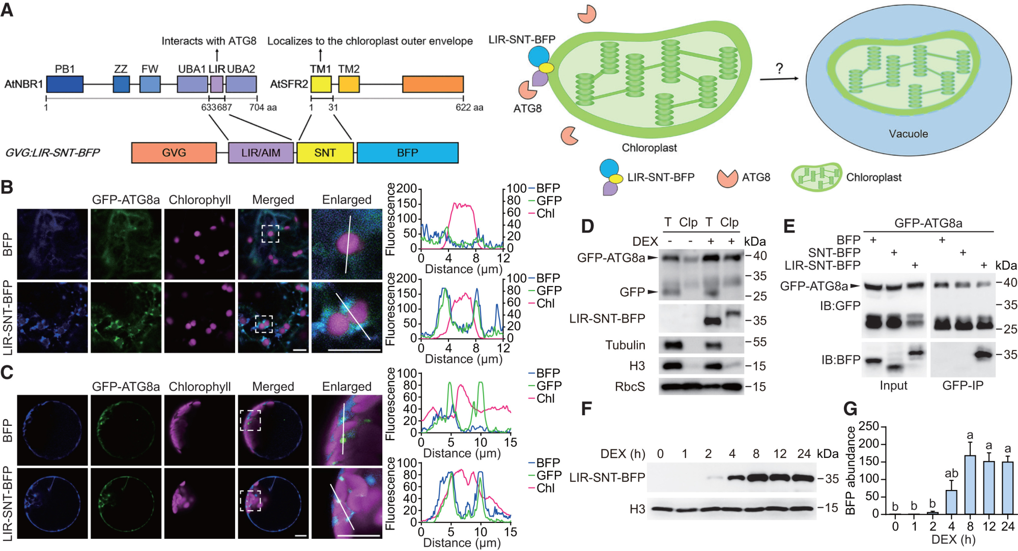 该研究以合成生物学思路构建了一个叶绿体自噬合成受体LIR-SNT-BFP。合成受体通过来自SFR2蛋白N端的定位序列,两亲性的α螺旋SNT,靶向定位于叶绿体外膜;通过来自NBR1蛋白的结合ATG8的片段LIR,招募ATG8;以糖皮质激素诱导系统实现对合成受体的可诱导表达。