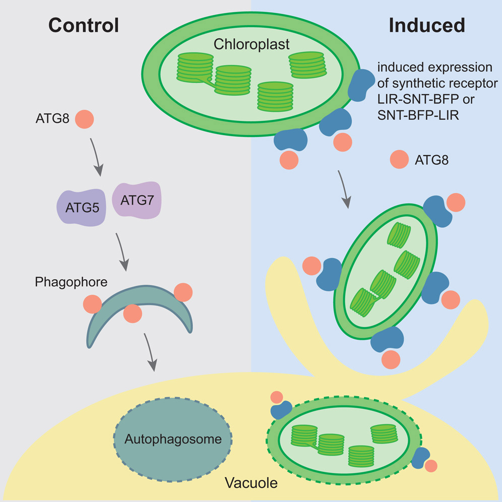图2. 合成受体介导的叶绿体微自噬降解的模式图