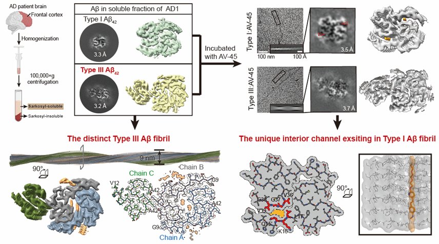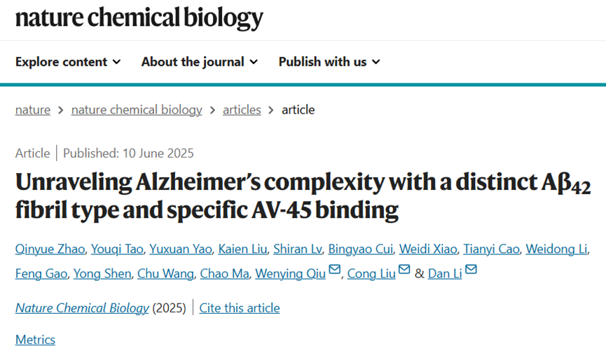 2025年6月11日,奈飞工厂 Bio-X研究院李丹团队、中国科学院上海有机化学研究所生物与化学交叉中心刘聪团队,联合中国医学科学院基础医学研究所仇文颖团队,在Nature Chemical Biology期刊上发表了题为“Unraveling Alzheimer's Complexity with a distinct Aβ42 Fibril Type and Specific AV-45 Binding”的研究论文。该工作在AD患者脑组织“可溶组分”中发现全新的Aβ42病理纤维聚集体类型(Type III),并首次阐明临床PET示踪剂AV-45识别Aβ42的分子机制,为AD的精准分子分型与新一代PET示踪剂的研发提供了理论依据与新思路。