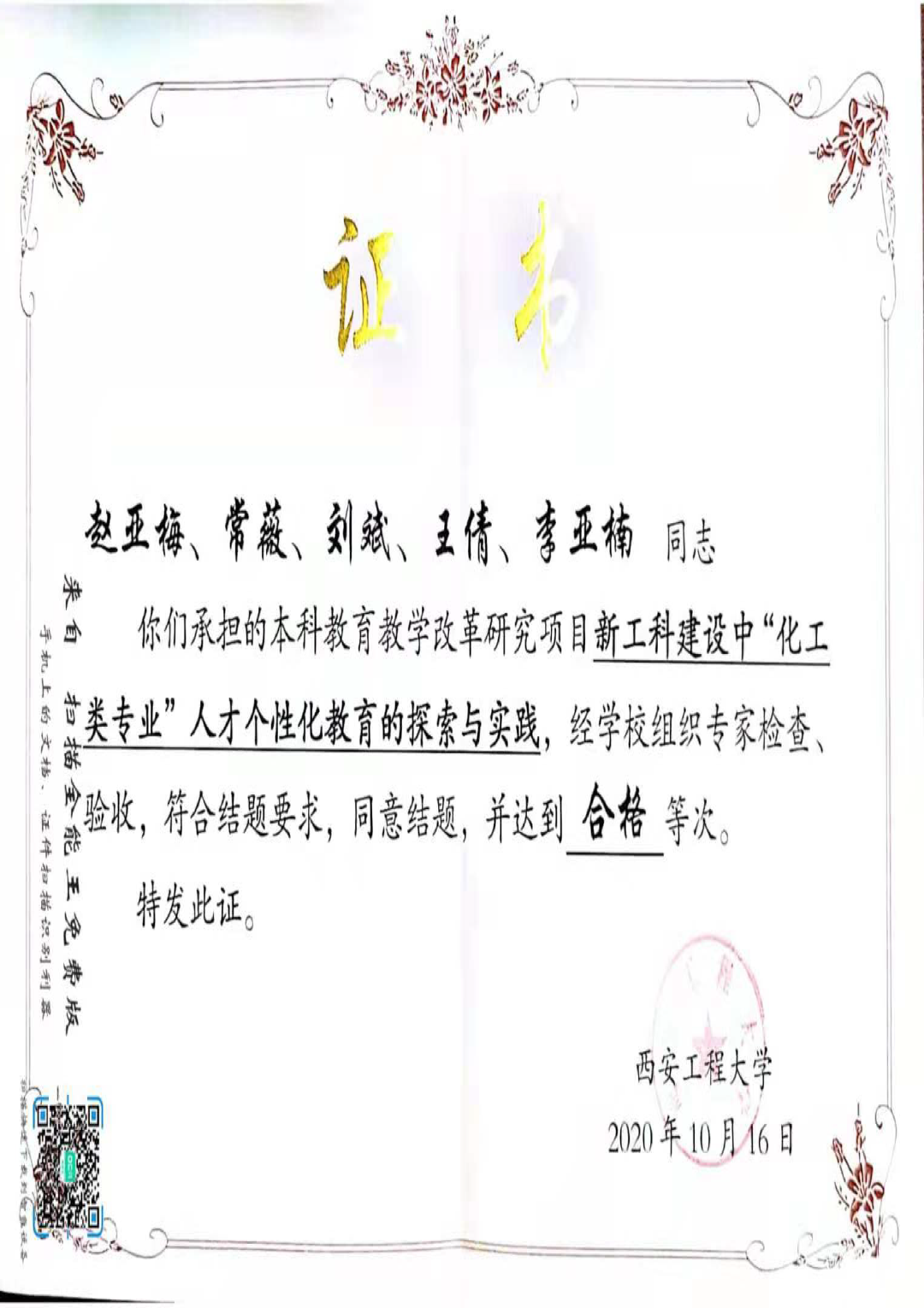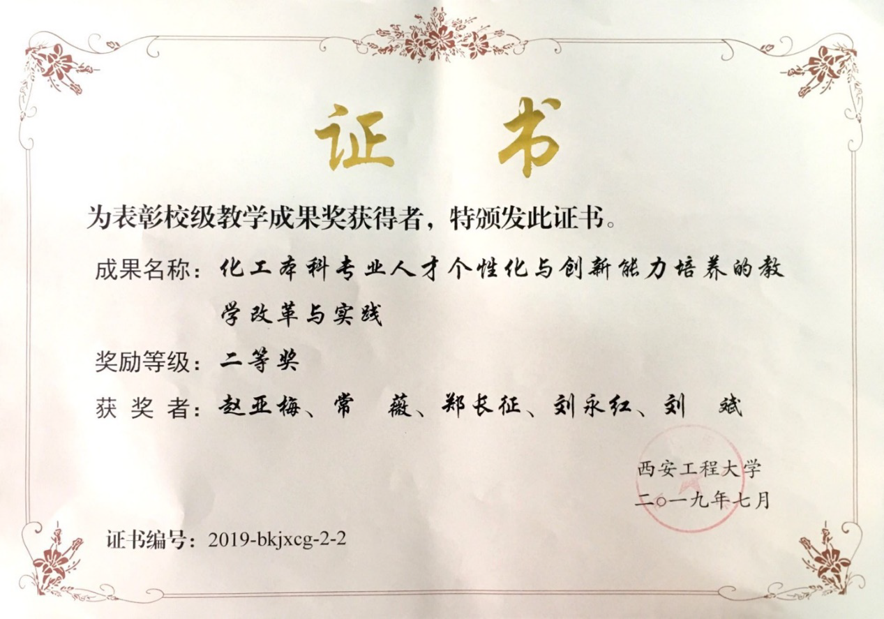 1. 2019年教学成果化工本科专业人才个性化与创新能力培养的教学改革与实践获校级二等奖;