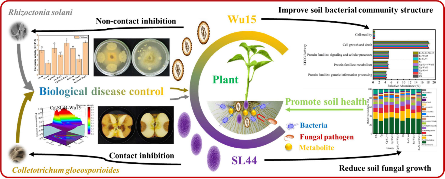 植物根际益生菌(PGPR)复合应用被认为是控制作物真菌病害的有效方式,但其协同作用机制尚未完全了解。在本研究中,枯草芽孢杆菌SL44和霍氏肠杆菌Wu15联合使用可降低苹果炭疽菌和立枯丝核菌的密度,表现出较强的协同效应,可有效抑制两种疾病的发生,促进菌丝表面有益菌的生长,从而减轻疾病的严重程度。同时,揭示了PGPR应用通过调节其代谢产物,如胞外聚合物质和几丁质酶,导致根际微生物群落的重组。这些代谢物对吸引和增强常规外围细菌、抑制真菌病原体和促进土壤健康具有积极作用。微生物群落结构的改善有效地改变了土壤真菌群落的营养模式。通过构建复合益生菌群的协同增效防病作用机制,为促进可持续农业发展和减少化肥料农药施用方面提供重要的理论指导和应用前景。