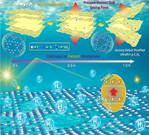 随着人类社会的不断发展,环境污染与能源短缺问题日益严重,光催化技术是解决这些问题的一个潜在方案。光催化技术的核心是光催化剂,迄今为止,人们已经开发出多种光催化剂材料。石墨相氮化碳(g-C3N4)作为一种非金属有机半导体光催化剂,因其具有制备简单、带隙合适、稳定性良好等优点,已被广泛研究。然而,它固有的比表面积小、可见光吸收效率低、电荷再结合速度快等缺点,极大地限制了其光催化性能。在不引入其他物质的情况下对g-C3N4进行结构修饰引起了人们的极大关注。该工作在真空度为-0.098 Mpa的真空气氛条件下通过热-压双驱动对体相g-C3N4进行热处理,合成了结构空位缺陷改性的双原子层状g-C3N4纳米片(VCN)。所制备的VCN具有大的比表面积和丰富的孔结构,为催化反应提供了更多的活性中心。同时,由于仅有两个石墨相氮化碳原子层的超薄结构(1.5 nm)导致转移路径极大缩短,光生电荷可迅速转移到VCN表面。此外,缺陷能级缓解了由纳米级g-C3N4量子尺寸效应引起的带隙增大的缺点,从而实现了良好的可见光利用。结果表明,VCN样品在光催化制氢和抗生素的光降解方面都表现出优异的性能。该工作证明了g-C3N4可通过结构自修饰以提高其光催化性能,从而为未来解决能源危机和环境污染提供了新的策略。