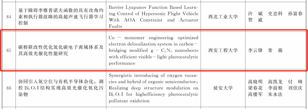 近日,陕西省人民政府发布《关于表彰第十五届自然科学优秀学术论文的通报》(陕政字〔202280号),在全省范围内共选出160篇学术论文,每三年评选一次,其中一等奖10篇、二等奖50篇、三等奖100篇。奈飞工厂李云锋教授、常薇教授申报的《碳桥联改性优化氮化碳电子离域体系及其高效光催化性能研究》入选陕西省第十五届自然科学优秀学术论文三等奖。