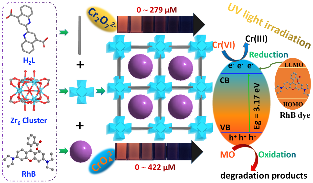 材料化工团队李庆副教授课题组针对在水环境化学中发挥重要作用的Zr-MOFs作为光化学探针和光催化剂时,其灵敏度、选择性和光敏性方面存在的技术瓶颈,开展关键科学、技术问题研究并取得新进展。相关研究成果以“RhB-Embedded Zirconium–Biquinoline-Based MOF Composite for Highly Sensitive Probing Cr(VI) and Photochemical Removal of CrO42-, Cr2O72-, and MO”为题发表于无机化学领域国际顶级期刊《Inorganic Chemistry》上(Inorg. Chem., 2022, 61, 15213–15224.中科院一区, IF = 5.436, Top期刊)。