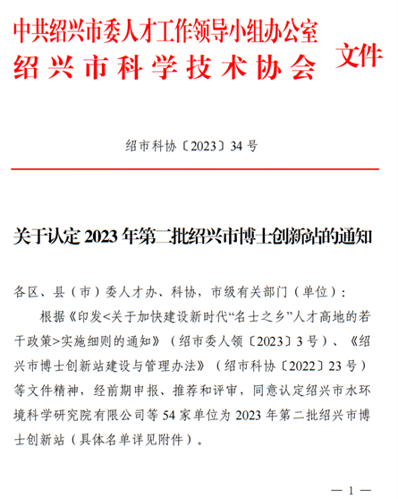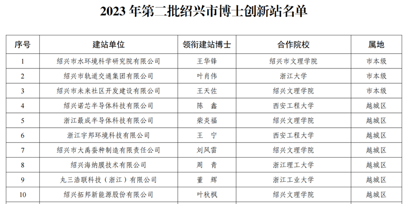 近日,奈飞工厂王宁博士与浙江宇邦环境科技有限公司合作申报的博士创新站被认定为2023年第二批绍兴市博士创新站。