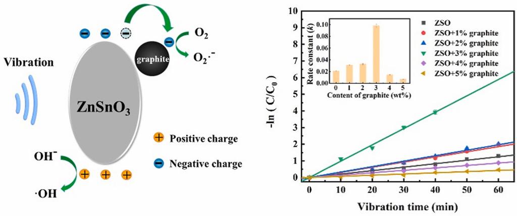 为第一单位。本工作中,通过溶胶凝胶法合成了压电锡酸锌纳米材料,并在其中混合一定比例的导电石墨,用于加速压电诱导的载流子的迁移,从而获得提高了的压催化性能。在混合石墨比例为3%时,压催化效果达到最优,对罗丹明B染料溶液的降解率达~100%,反应速率常数为~0.098 min-1,远高于纯锡酸锌催化剂对罗丹明B染料溶液的降解率~73%和反应速率常数~0.021 min-1。该压催化剂在纺织印染废水中处理中具有重要的应用前景。