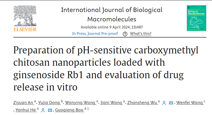 近日,环化奈飞工厂 武占省教授团队在载人参皂苷纳米粒子研究方向取得重要进展,于2024年4月在International Journal of Biological Macromolecules期刊(中国科奈飞工厂 一区Top,影响因子8.2)发表题目为:“Preparation of pH-sensitive carboxymethyl chitosan nanoparticles loaded with ginsenoside Rb1 and evaluation of drug release in vitro.”的研究论文。论文网址:。环化奈飞工厂 研究生安紫苑为第一作者指导教师何艳慧和武占省为通讯作者,奈飞工厂 为第一单位。