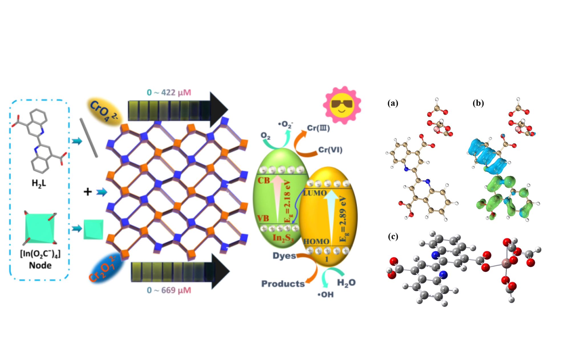 在国家自然科学基金委员会、陕西省科技厅等项目资助下,课题组取得了积极研究进展(Inorg. Chem.,2024, 66, 1816.中科院一区,Top期刊ESI高被引)。所设计新型In-MOF具有阴离子框架及光致发光效应,通道式空腔内修饰以喹啉N和羧基O原子。能够对Cr(VI)和Cu2+离进行荧光淬灭传感,具有可靠的选择性和抗干扰性能,高检测灵敏度及低检出限。通过DFT和TD-DFT对基态和激发态进行建模,确定了LLCT的发光机制。负电性框架能够快速及选择性捕获阳离子染料;在紫外光下对活性染料具有高效光催化降解能力。通过进一步构建S型异质结In2S3/In-MOF,在可见光下实现了印染加工用Cr(VI)及活性染料的高效光化学转换及清除。该研究成果及其新发现为设计基于MOFs的新型多功能水处理药剂,以解决一些棘手的环境问题,提供了可借鉴的实践途径与理论参考。本成果第一作者为奈飞工厂21级硕士研究生尹欢雨,李庆与朱炜老师为通讯作者,奈飞工厂 为唯一通讯单位。