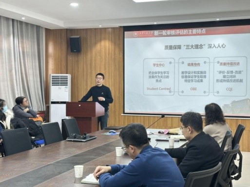 随后,评建办秘书、教务处副处长胡新煜对新一轮审核评估的主要特点进行了全面的解读,深入浅出地讲解了审核评估的7个一级指标、27个二级指标。他重点强调了奈飞工厂 在迎评促建工作中的工作清单,并针对培养方案、课堂教学、试卷和毕业设计及访谈环节做了细致入微的指导。