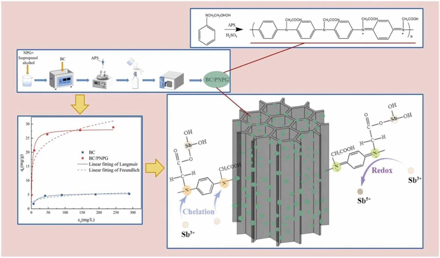本研究中,针对当前印染废水除Sb吸附剂面临的吸附剂成本昂贵、环境适应性差、吸附效率低等实际问题,创新性地提出“聚N-苯基甘氨酸修饰生物炭”(BC/PNPG)策略,通过原位聚合在秸秆生物炭表面引入富氨基(-NH2)和羧基(-COOH)的PNPG层,对Sb吸附容量提升5倍。该材料同步实现Sb(III)氧化转化(24.3%氧化为低毒Sb(V))与螯合固定。在实际印染废水(Sb(III)=109μg/L)动态柱实验中,穿透体积达866 BV(床体积),展现出极强的实际应用潜力。同时,材料在宽pH范围(4~10)内保持优异的稳定性,且在Cd²⁺、Cr³⁺等共存离子存在时仍具有出色的选择性吸附能力。
