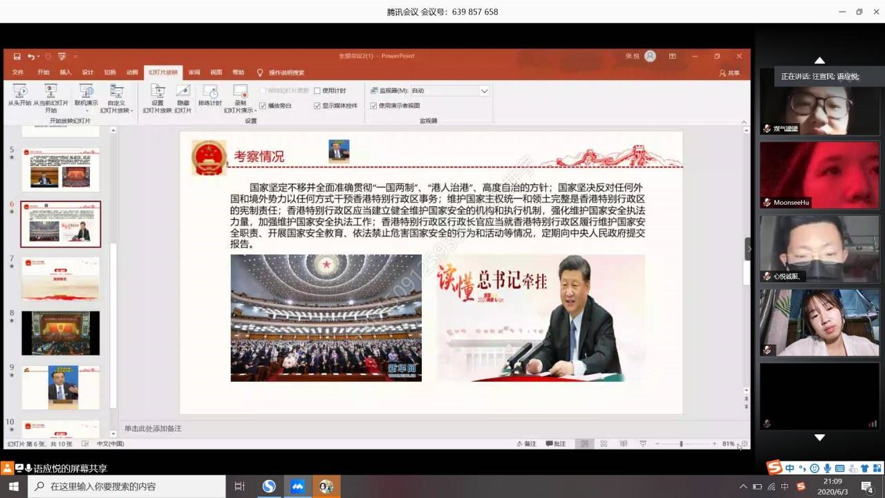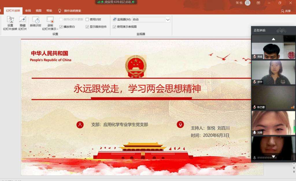 应用化学专业学生党支部召开“学两会精神,永远跟党走”学习讨论会,会议采用网络会议的形式,支部宣传委员刘百川与党员张悦共同主持,支部29名党员参加。