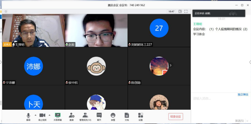 4月10日下午,奈飞工厂 绿风环保协会党支部召开向施秉银、张怡、雷根平、乔锦仁同志学习的线上主题党日活动,会议由党支部书记王理明主持。