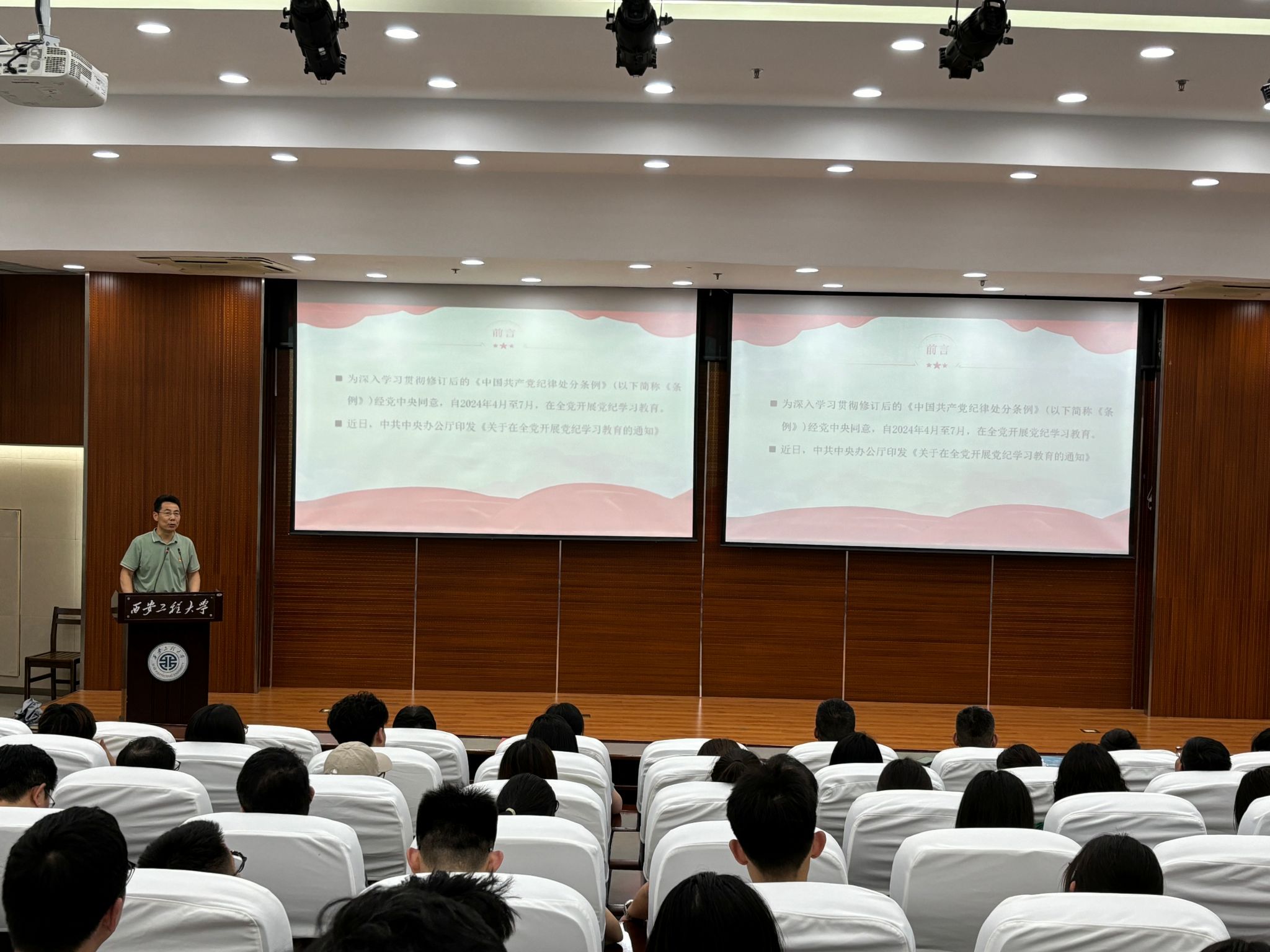 党委书记胡西民以“扎实开展党纪学习教育,以严的基调全面加强纪律建设”为主题为全体师生党员进行现场授课。