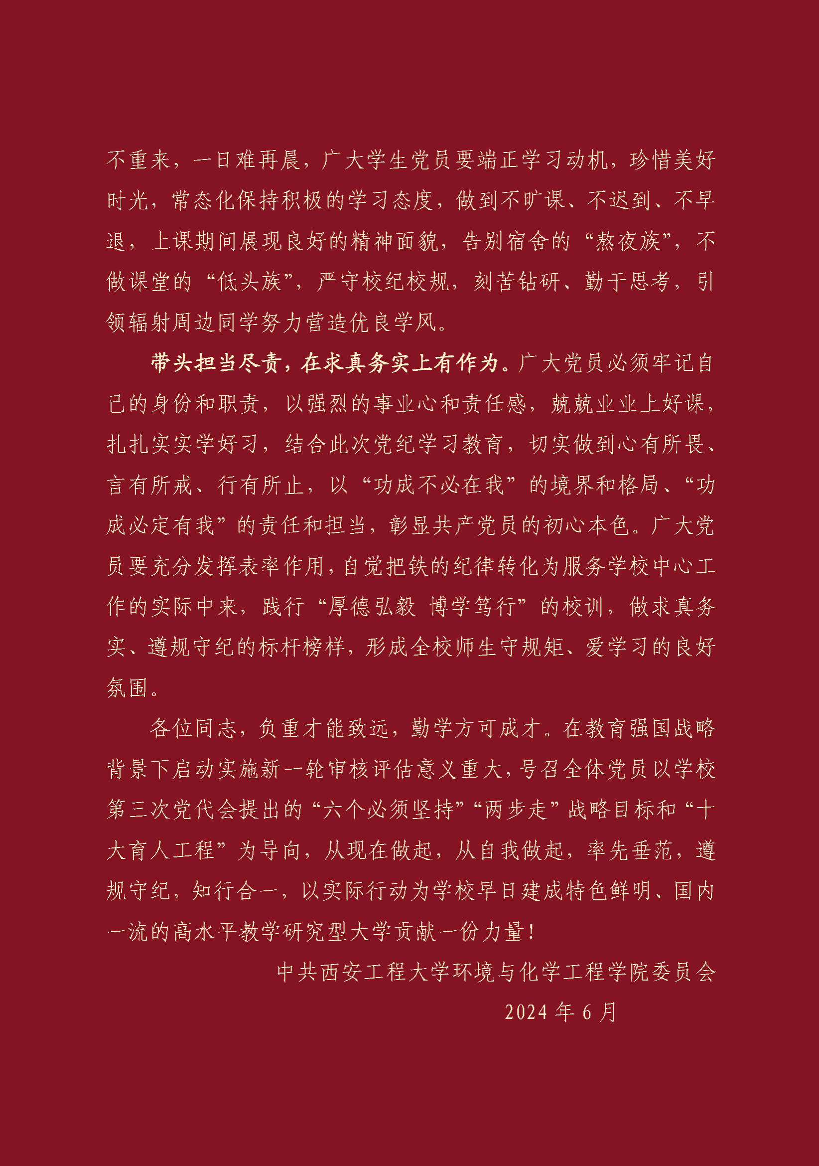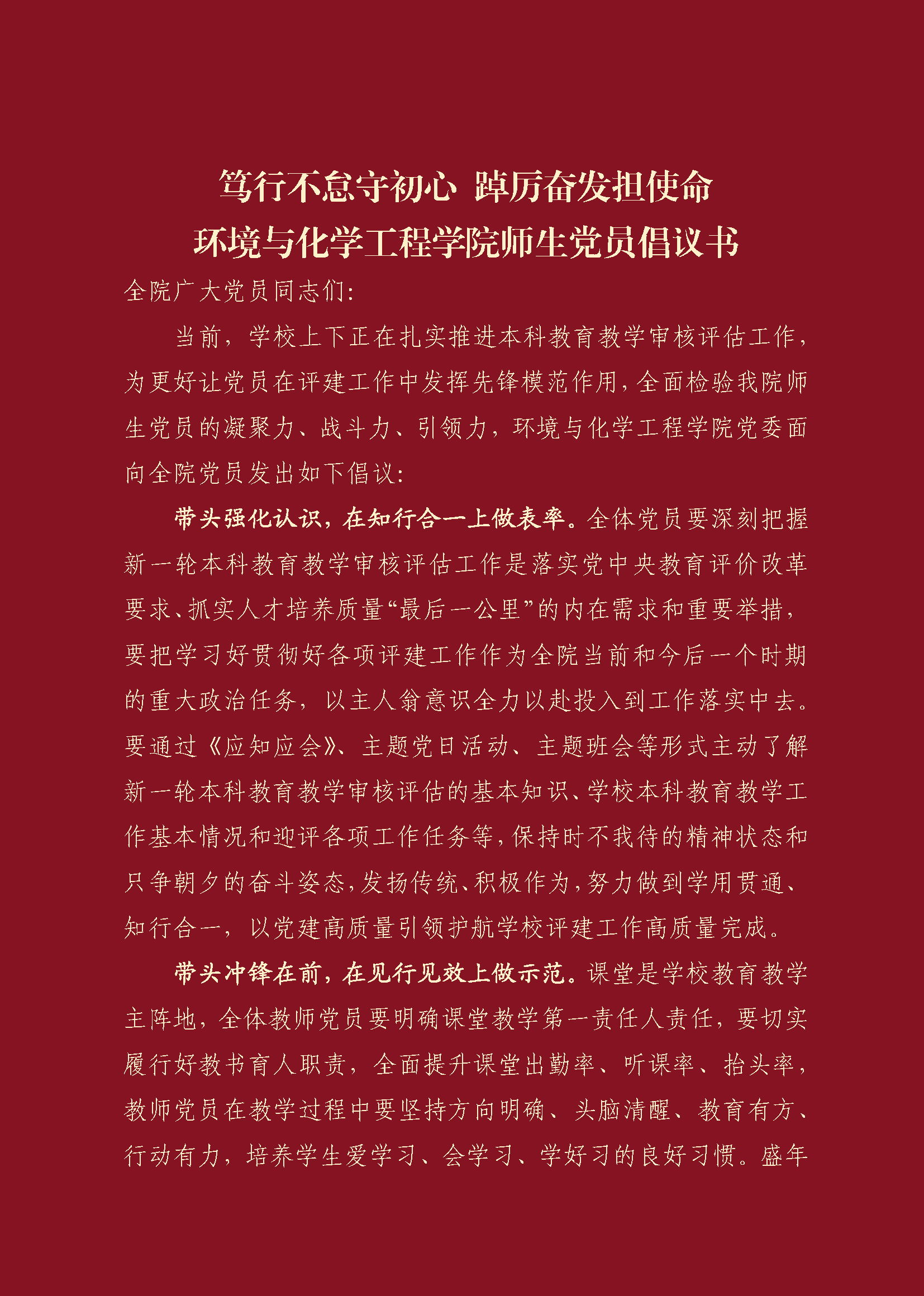 教师和学生发出倡议,围绕审核评估工作过程中,师生党员“做什么”“怎么做”“做成什么样”等问题提出要求。《倡议书》中提到,全体党员要把学习好贯彻好各项评建工作作为全院当前和今后一个时期的重大政治任务,以主人翁意识全力以赴投入到工作落实中去。广大教师要切实履行好教书育人职责,坚持方向明确、头脑清醒、教育有方、行动有力,培养学生爱学习、会学习、学好习的良好习惯。广大学生党员要端正学习动机,珍惜美好时光,展现良好的精神面貌,引领辐射周边同学努力营造优良学风。《倡议书》还要求广大党员要自觉把铁的纪律转化为服务学校中心工作的实际中来,践行“厚德弘毅 博学笃行”的校训,做求真务实、遵规守纪的标杆榜样,形成全校师生守规矩、爱学习的良好氛围。