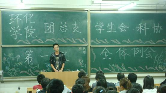 会中团总支副书记史良提到要敢于表达自己,让别人认识到自己,并且要学会倾听。科协两位副主席介绍了各项活动,例如:119防火知识讲座、希望杯、挑战杯等。学生会主席涂强结合自身向新会员传达了一种“竭尽自我,服务环化”的精神,将大会的气氛推向高潮。最后,由11级新会员代表发言。