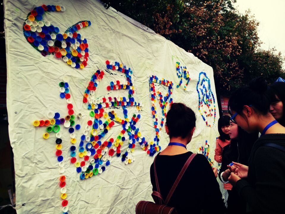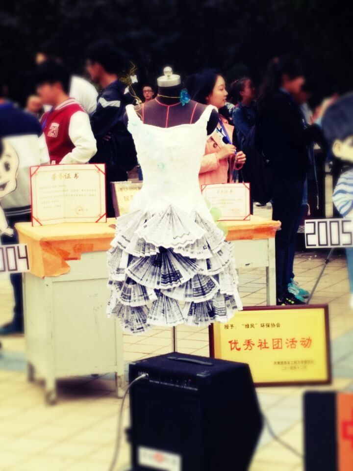 中心广场搭建会展舞台,场地以一枚四层纸质手工蛋糕为主体,蛋糕顶部有一支折叠小花饰成的“16”字样,象征“绿风”十六周岁。卡通人物 象征“绿风”成长历程。由新闻编辑部制作的巨幅金色请柬立于蛋糕前,以示诚挚邀请广大师生前来参观,蛋糕四周环绕摆放了三个不同年龄段的卡通纸质人物,象征“绿风”一路的成长历程,其中人物旁的各种证书和奖状更是“绿风”取得丰硕成果的最好见证。照片墙展示“绿风”活动风采。活动现场还放置了十六年来的各类活动剪影,整个会场布置鲜亮缤纷,富有动感,每一个设计都具有其独特的意义。手工展品传达环保理念。志愿者部创作了一件别致的衣服,材料只使用了废旧报纸和不用的生活物品,充分展示了其部门创意,也向广大师生传达了环保的理念。生日歌曲弹奏生日歌送祝福会展期间,“绿风”社员给大家热情介了绍“绿风”的成长历程。既有遭遇的坎坷,也有创造的辉煌。泽韵琴行也献上一首生日歌为其诚挚祝福。最后,社员热情邀请同学参与到“贴瓶盖”这一环保趣味小游戏中来,各路同学也纷纷送来祝愿,展出的各种作品受到了同学们的一致好评,会展全程气氛高昂,成果展后“绿风”全体新老成员开展了交流座谈会。