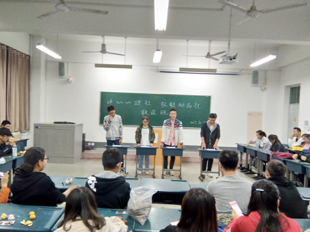 译心心理社与弘毅励志社于2017年10月21日在c374教室特别举办联谊晚会活动,联络全体社员的感情,增强集体合作能力和集体荣誉感。在主持人精彩致开场词后,由弘毅励志社17级成员带来小品《空城计》,紧接着由译心心理社部长带来相声《我的大学生活是这样的》,诗朗诵《我的南方与北方》,他们精彩的表演赢得了阵阵掌声。紧接着我们举办了抢凳子小游戏,各类节目赏心悦目,精彩纷呈。在活动最后,译心心理社和弘毅励志社成员集体合影,庆祝两社团联谊活动圆满结束。