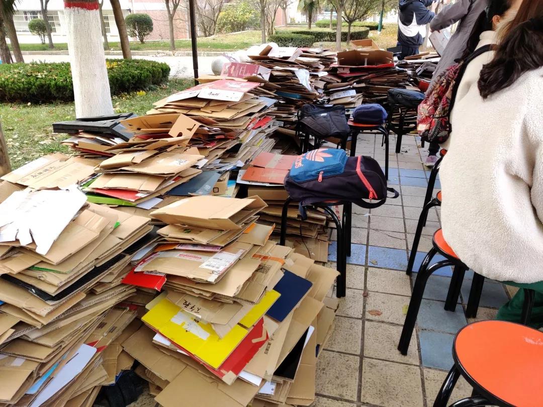 活动开始,同学们纷纷将自己搁置的纸箱捐赠到活动大棚处。随后在绿风干事的指导下,同学们撕掉纸箱的胶带并压平纸箱,这样既节省了空间和处理时间,又减轻了工作人员的负担。活动中,收集到数百个纸箱。提现了同学们参与环保活动的热情和环保活动的支持,工作人员也体验到参与环保工作的艰辛。无论遇到怎样的困难,绿风干事始终铭记绿风的宗旨:“用我们的努力去换取美好的环境!”,不忘初心、牢记使命,继续为环保事业贡献力量。