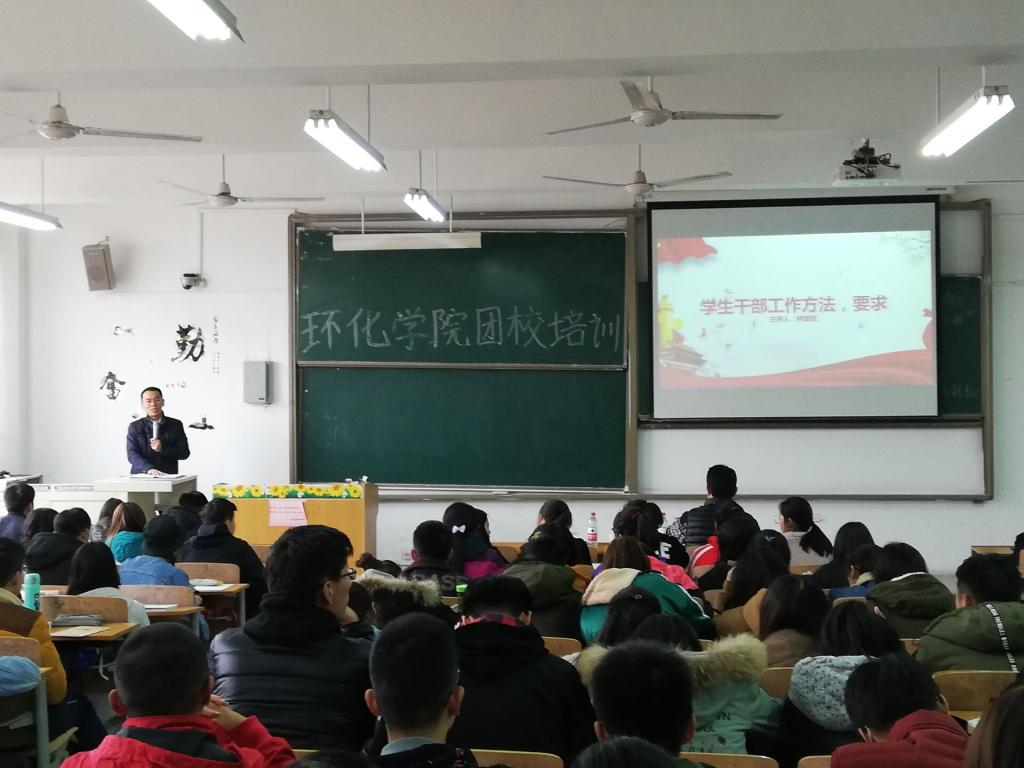 首先,全体合唱团歌,随后贾天昱带领全体学员重温入团誓词。在观看完“辉煌中国”纪录片之后,开始本期团校培训班的授课。林定武主要讲授学生干部的工作方法和工作要求。指出,学生干部不能有官僚之风;学生干部要有积极上进之心,要敢于实践;对工作敢于提意见和建议;要以积极良好的态度服务于同学。贾天昱则主要讲授认真学习贯彻习近平总书记重要讲话和共青团十八大精神,结合实际,进行分组讨论、经验交流和实践教学活动。