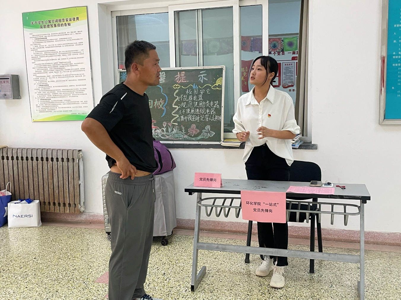 团委精心布置迎新点和一站式学生社区,统筹调配工作人员力量,为新生和家长提供休息、寄存、咨询等服务;迎新点的志愿者们耐心解答新生在注册报到、学习安排、校园生活等方面的疑问,帮助新同学熟悉并适应学校的新生活;一站式学生社区还设有党员先锋岗,热情地帮助新生们办理住宿登记、办理入住,营造到校如归家的温馨氛围。