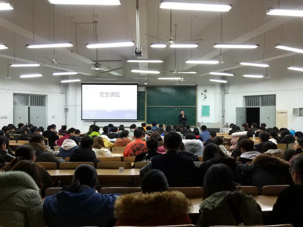 于临潼校区B-133教室顺利举办了“名生讲坛”活动。学工办主任林定武、15级优秀学生代表丁思奇、2018年国家奖学金获得者张艳杰、邵旭及17级全体学生参与此次活动。