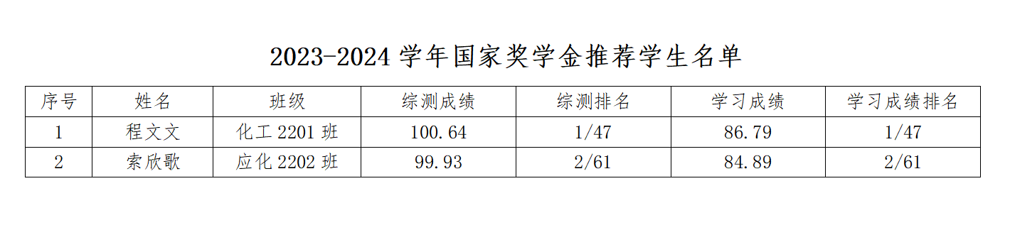 国家奖学金评审小组投票推荐等程序,拟推荐程文文、索欣歌两位同学作为2023-2024学年本科生国家奖学金追加名额推荐人选,具体名单如下。