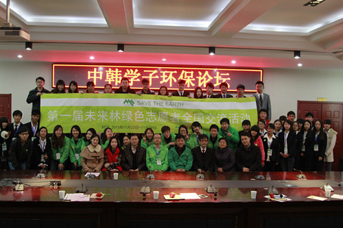 下午2:30,论坛正式开始。王晓先对韩国朋友表示热烈的欢迎,希望加强中韩两国青年环保组织的交流与合作。袁群在讲话中指出:“中韩两国隔海相望,中韩关系也在诸多领域取得了突飞猛进的发展,希望借此交流会与未来林的志愿者能在环保的道路上有更多的合作,为保护环境做出高校大学生应有的贡献,为促进中国与韩国的文化交流再添一抹新绿。”权赫大先生通过PPT向大家展示了人类面临着的严峻的土地沙漠化的环境问题,以及未来林组织所取得的成就,希望大家从切实的身边小事做起,保护人类赖以生存的地球。