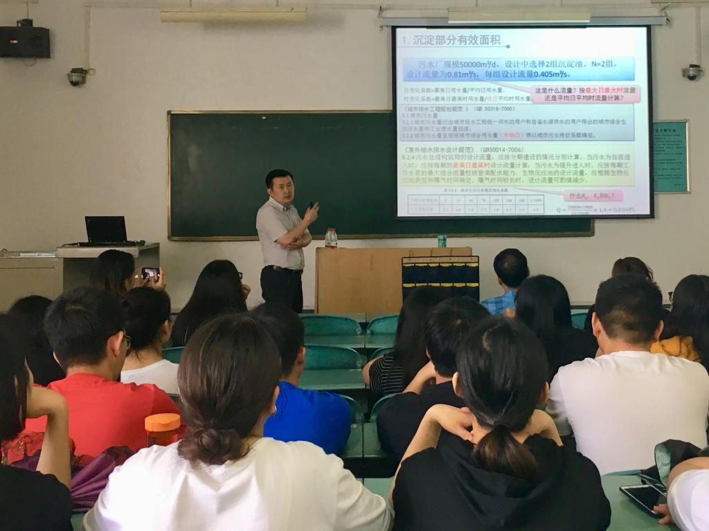 报告会上,孙所长结合环境工程专业工程教育认证中毕业生所需具备的专业能力,以工程常见的辐流式沉淀池为例,为大家详细介绍了沉淀池各部分构造,讲解了如何按照设计规范合理选取参数进行设计计算;结合规范的工程CAD图纸讲述了如何绘制环境工程平面图、高程图等内容,并对大四学生在毕业设计中遇到的计算绘图等问题进行了详细解答。