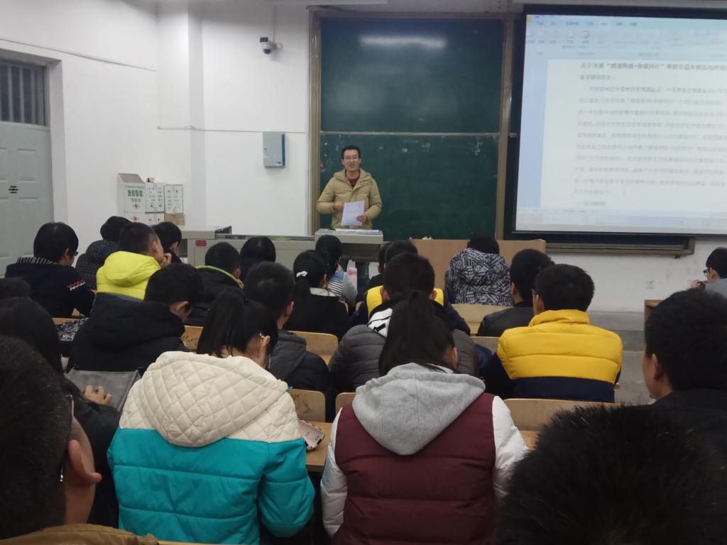 在临潼校区B-135举办了“感谢师恩•你我同行”寒假公益动员大会,参加大会的有团学科主要干部以及16级全体学生,本次会议由王春元主持。
