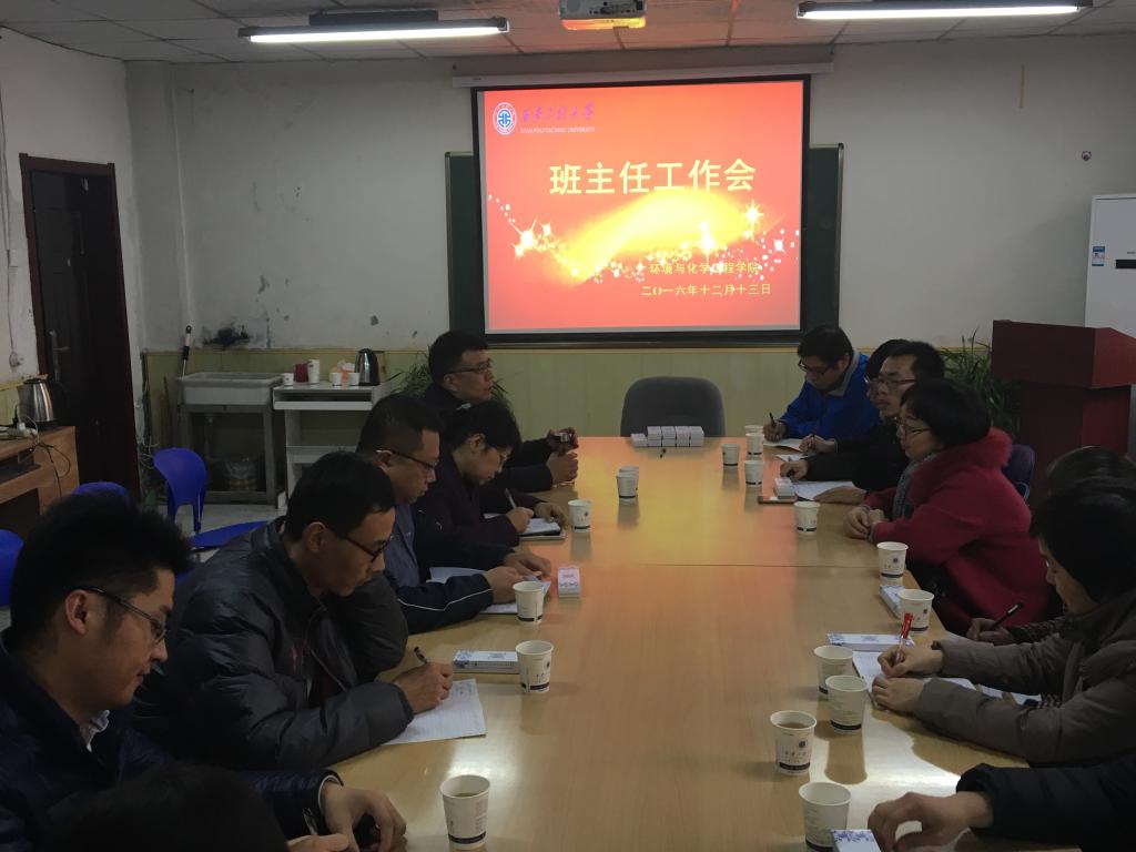 会议首先由学工办主任林定武对本学期末班主任的工作重点做了提示:一是,加强诚信教育,要求学生严格遵守考风考纪;二是,抓好班级、宿舍安全工作。宿舍要注意防火、防盗、防骗,宿舍内严禁使用违章电器,同时提醒同学注意外出安全;三是,关注特殊学生群体。要将此项工作作为班级管理的常态工作来抓,通过班委、宿舍长及时了解学生动态;四是,加强学生学业指导。班主任可以对班级学生的就业方向、学科竞赛等多作指导,提高学生专业兴趣。