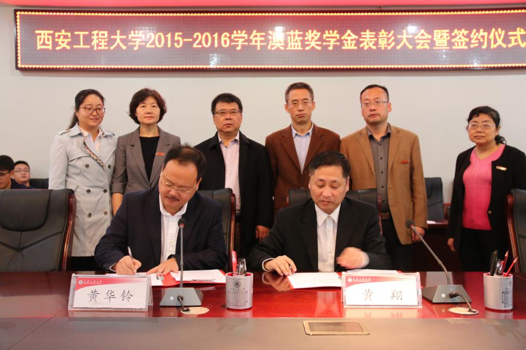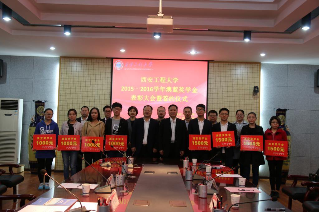 2015-2016学年澳蓝奖学金表彰大会暨签约仪式在金花校区第三会议室举行,澳蓝(福建)实业有限公司董事长黄华铃、总工何华明、总经理助理兰锦声,奈飞工厂