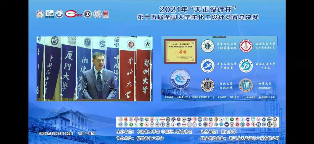 2021年8月21至8月22日,“天正设计杯”第十五届全国大学生化工设计竞赛全国总决赛在厦门大学顺利举办。本届大赛围绕“为某大型化工企业设计一座异丙醇生产分厂或为现有的异丙醇生产分厂设计技术改造方案”展开,经过西北、西南、华北、华南、华东、华中和东北等七个赛区激烈角逐,我校“天赋异禀的醇”参赛队从全国401所高校的2767支队伍中脱颖而出,进入全国前60强并荣获全国一等奖,这是我校参加该赛事八年以来首次获得此项殊荣。
