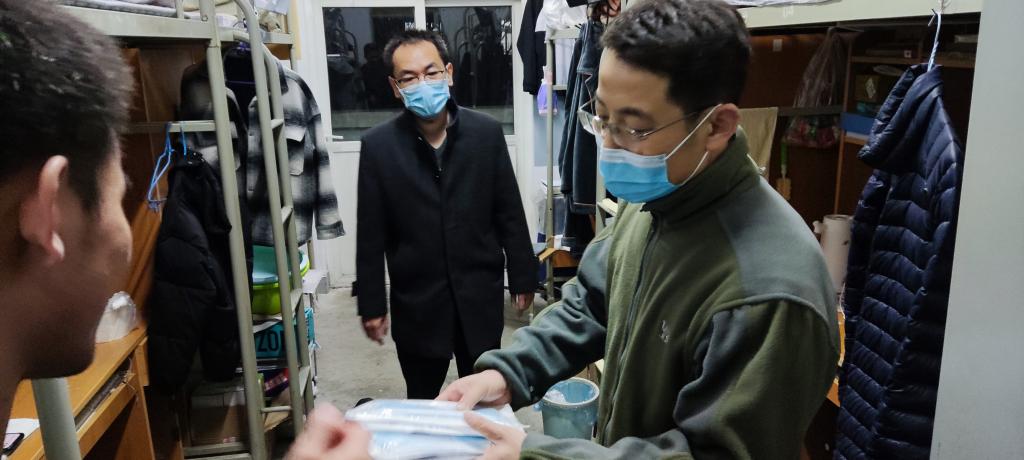 党委书记胡西民和副书记林定武书记走访学生宿舍,为所有研究生发放防疫物资,并与他们展开深入的交流。