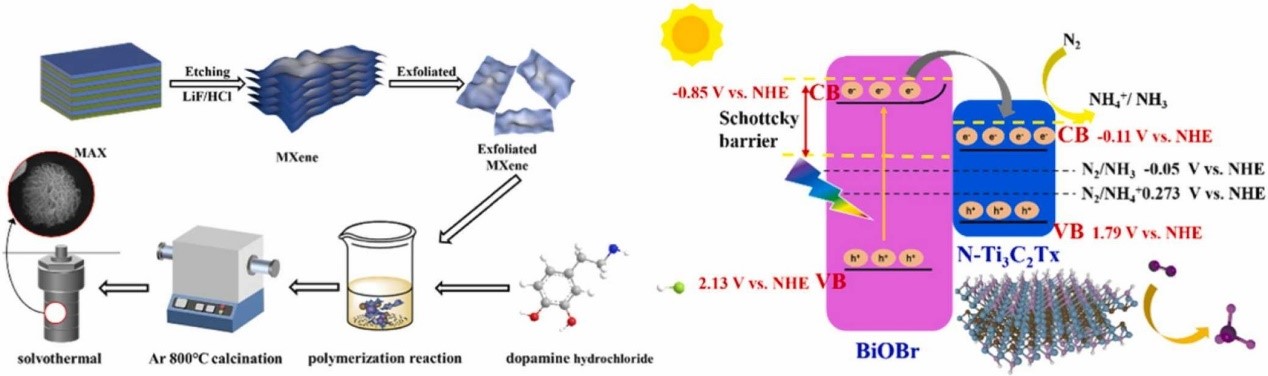 由于NH3的强N≡N键能、高电离能和较差的质子亲和力,在温和条件下合成NH3仍然是一个重大挑战。本研究采用盐酸多巴胺在Ti3C2Tx MXene表面进行原位聚合,随后,采用溶剂热法使N掺杂在Ti3C2Tx MXene表面原位诱导生长,制备了高比表面积、高折叠度的N-Ti3C2Tx MXene/BiOBr异质结。结果表明,BiOBr均匀地分散在N-Ti3C2Tx MXene表面。光催化氨产出率为270.73 μmol /g·h,是单独BiOBr的3.27倍,连续5次循环后仍能保持60%左右的产析出率。光催化机制是N-Ti3C2Tx MXene纳米片的高度分散和高导带电位促进电荷转移到纳米片的活性位点。本研究证明了盐酸多巴胺在太阳能利用MXene光催化材料中的潜在应用,此外,前期研究中在光催化NH3生产中,Bi4O5Br2锚定在具有欧姆异质结的Ti3C2MXene上,通过实验和理论计算相结合解析了光催化合成氨的机制(Journal of Colloid and Interface Science.2021,SCI一区, IF=9.965, Top期刊,奈飞工厂