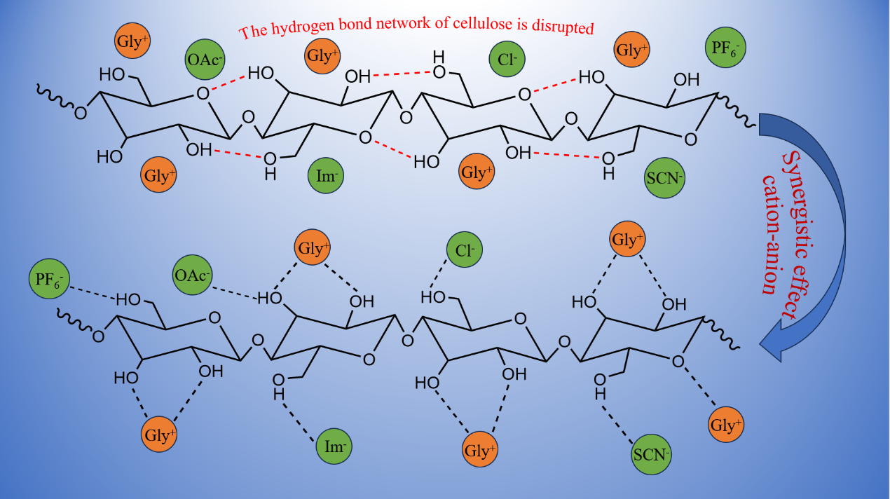 作为第三代新型离子液体的氨基酸离子液体(amino acid ionic liquids, AAILs)具有较低的毒性、良好的生物相容性和生物可降解性。这种特性使得氨基酸离子液体成为连接化学合成与生物技术应用的重要桥梁,为在温和条件下实现高效、精准的化学转化提供了可能,在绿色化学和可持续化学中具有重要意义。纤维素作为地球上最丰富的可再生资源之一,其高效转化为高性能产品(如生物塑料、生物燃料、功能纤维等)对于推动能源转型、减少碳排放、促进绿色经济具有战略意义。氨基酸离子液体的应用不仅能显著提升纤维素转化的效率和选择性,还能确保整个转化过程的绿色性和可持续性,为实现环境友好型化学品的生产开辟了新途径。