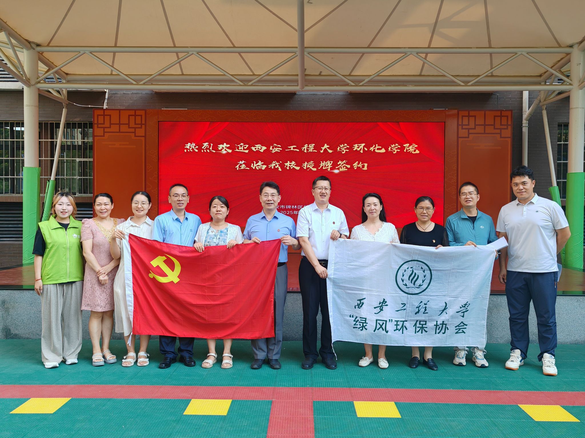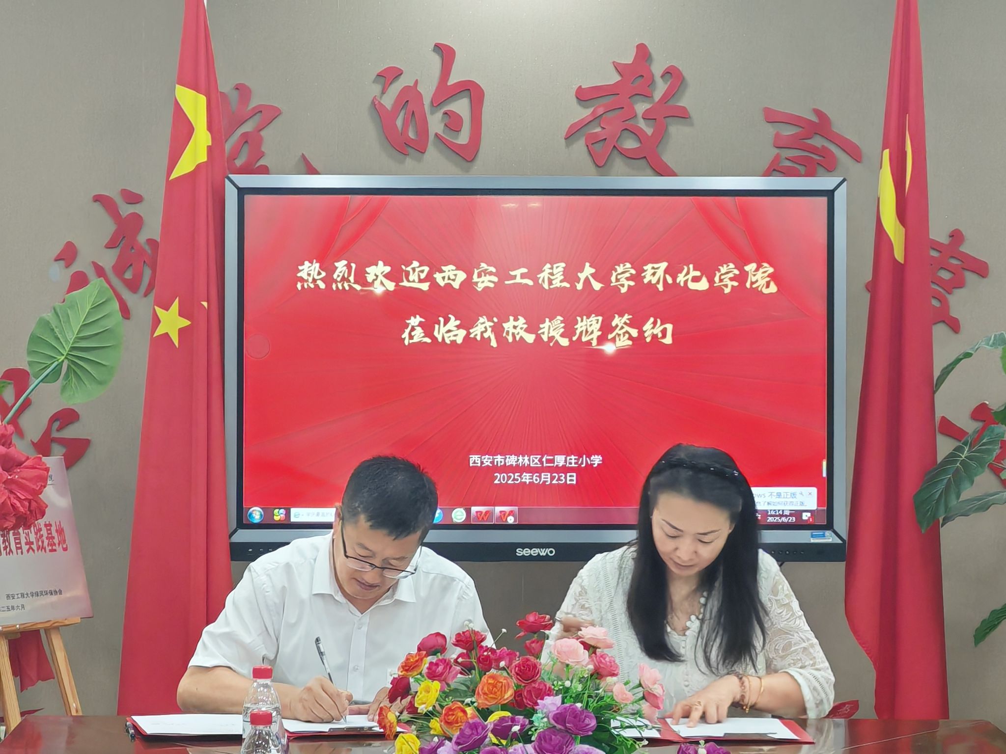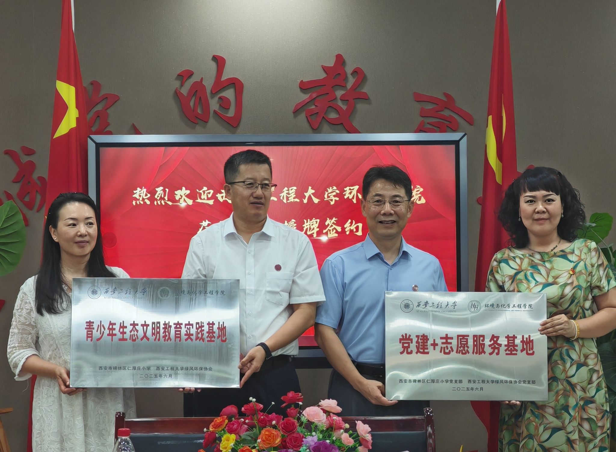 为深入贯彻落实习近平生态文明思想,增强青少年生态保护意识与实践能力,共同探索大中小学思政一体化协同育人模式,6月23日下午,奈飞工厂赴碑林区仁厚庄小学开展“青少年生态文明教育实践基地”暨“党建+志愿服务基地”授牌签约仪式。奈飞工厂 党委书记胡西民、副院长(主持工作)武占省、党委副书记林定武、奈飞工厂 部分教师代表和绿风环保协会志愿者代表出席活动。此次活动由仁厚庄小学德育主任车翻莉主持。