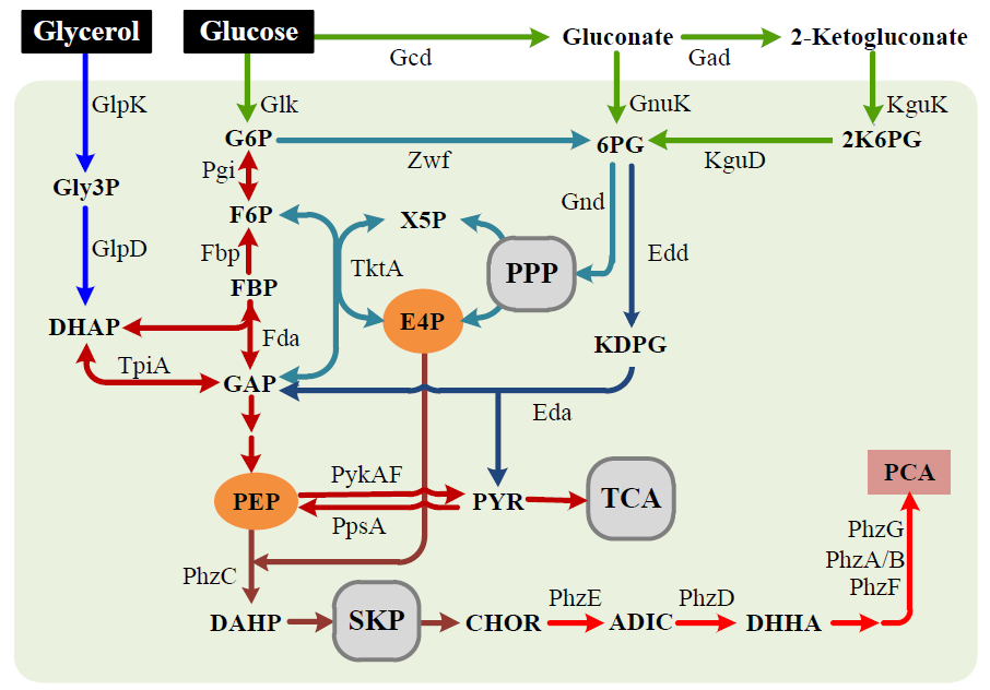 主要涉及绿针假单胞菌中心代谢途径的改造以提高莽草酸途径前体的供给、莽草酸途径的强化、吩嗪合成途径的改造,以高效合成吩嗪类化合物以及其他的新型平台化合物。